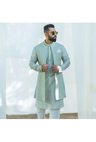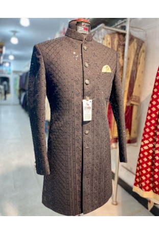 An intricate embroidery pattern is carefully engineered on this classic achkan style. Jewel buttons accentuate this style and the vibrant, rich and lustrous fabric balances out the overall design beautifully...