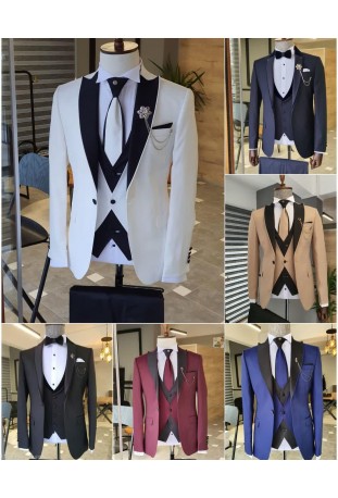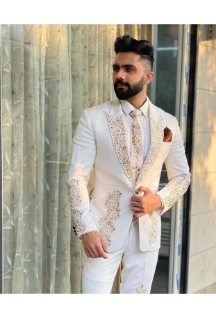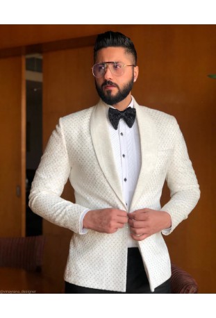 White tuxedo with black trouser, is made from siyaram’s (matrial) fabric and White satincotton shirt It’s good for all weather, including summers. The fabric is soft and has a great comfort feel to it. When you buy from us, we commit to giving you the best custom tailored suits online than the bad fitting readymade suits for men online. Rest assure..