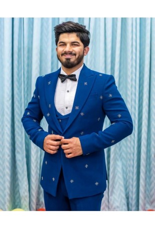 Royal blue 3 psc suit is made from Italian terry rayon fabric and White Giza cotton fabric shirt It’s good for all weather, including summers. The fabric is soft and has a great comfort feel to it. When you buy from us, we commit to giving you the best custom tailored suits online than the bad fitting readymade suits for men online. Rest assured, w..
