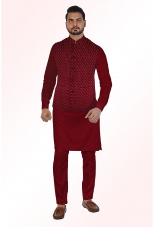 Designer fabric with W pattern Nehru Jacket with red color is made by Imported fabric for wedding function with satin cotton kurta and trouser. It’s good for all seasons, including summers. The fabric is soft and has a great comfortable feel to it. When you buy from us, we commit to giving you the best custom tailored suits online than the bad fitt..