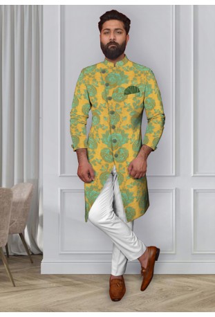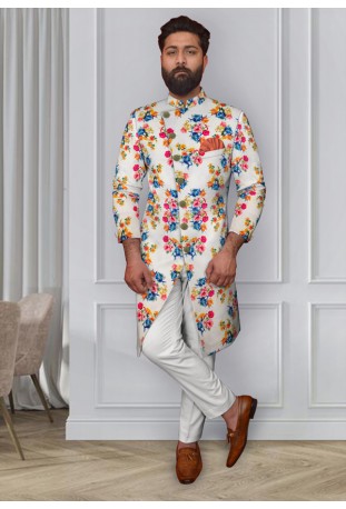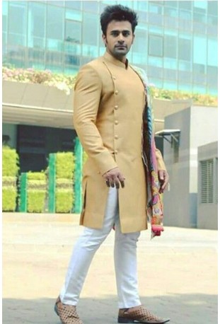 Beige textured indo western is made from imported t terry rayon extured fabric and printed stall and white trouser It’s good for all seasons, including summers. The fabric is soft and has a great comfort feel to it. When you buy from us, we commit to giving you the best custom tailored suits online than the bad fitting readymade suits for men onlin..