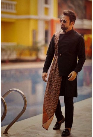 Black designed kurta is made by satin cotton fabric and cotton white trouser It’s good for all-weather, including summers. The fabric is soft and has a great comfort feel to it. When you buy from us, we commit to giving you the best custom tailored suits online than the bad fitting readymade suits for men online. Rest assured, we keep our quality p..